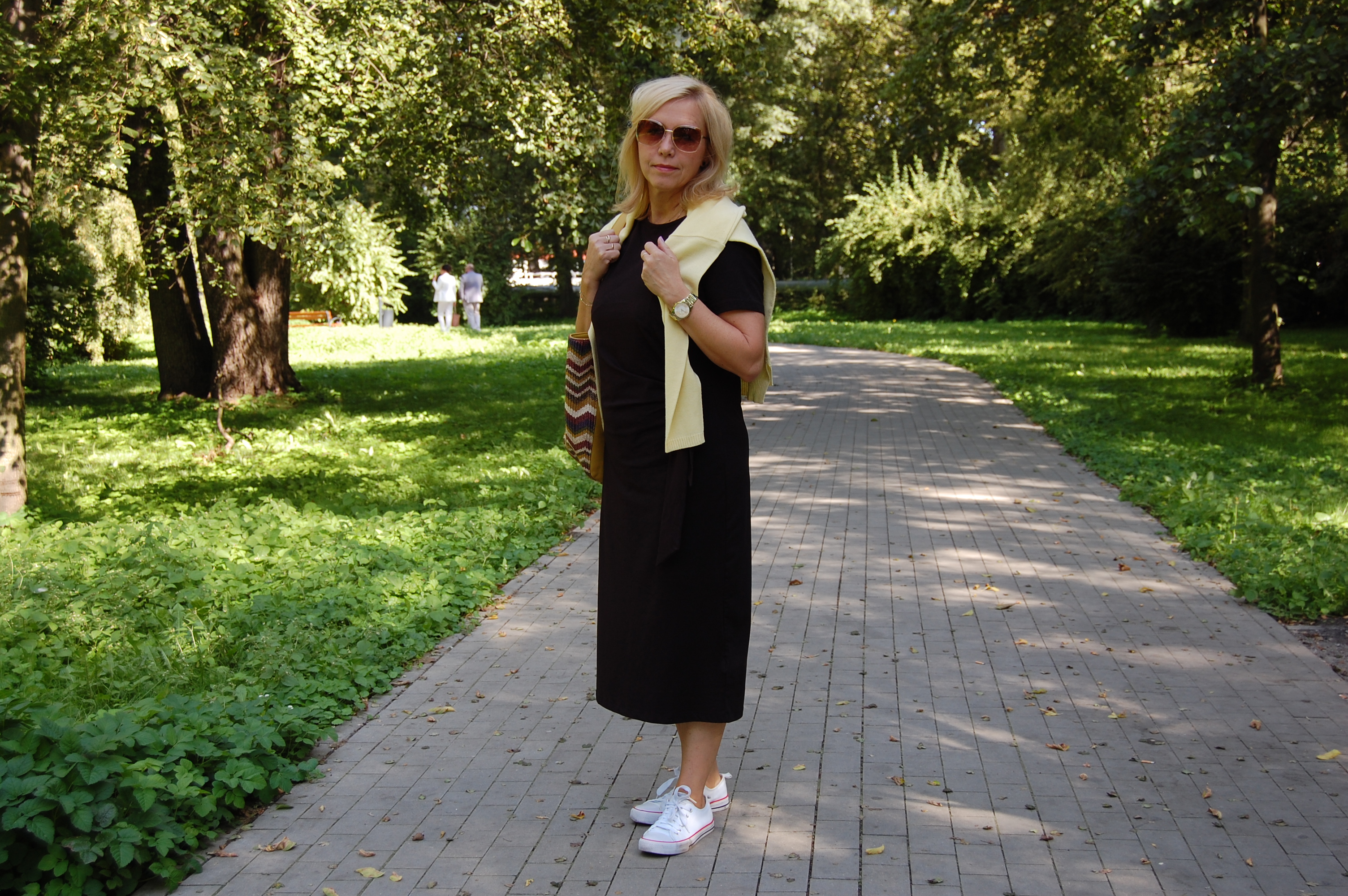 Witam po małej przerwie. W sierpniu dopadł mnie koronawirus, więc wiadomo. Uważajcie na siebie, tym bardziej, że zbliża się już niestety jesienna pora. Słońce jeszcze dziś pięknie świeci, ale już ten chłodny wiatr swoje robi. Dlatego też na mój nowy nabytek, a mianowicie czarną sukienkę z dżerseju narzuciłam dżinsową kurtkę, albo też w wersji drugiej, żółty, lekki sweter.